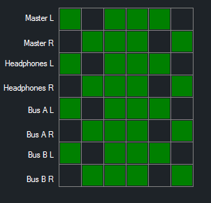 Each column represents a source channel, each row represents a destination bus that the channel can be routed to.